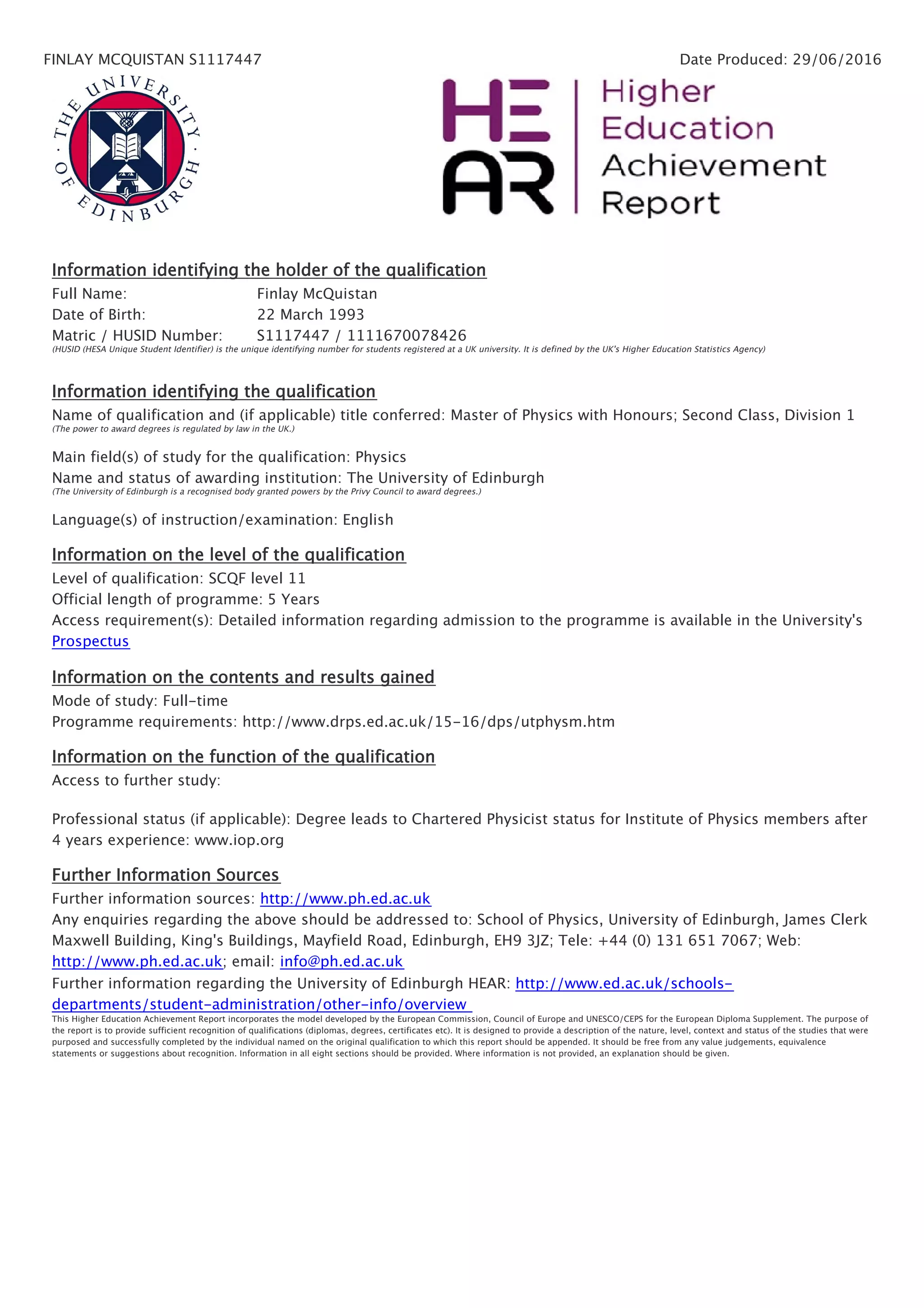 Finlay McQuistan earned a Master of Physics with Honours degree from the University of Edinburgh in 2016. He studied physics full-time for 5 years and achieved a Second Class Division 1 classification. Some of his coursework included astronomy, mathematics, quantum mechanics, and a senior honors project. He is now eligible for Chartered Physicist status after 4 years of experience.