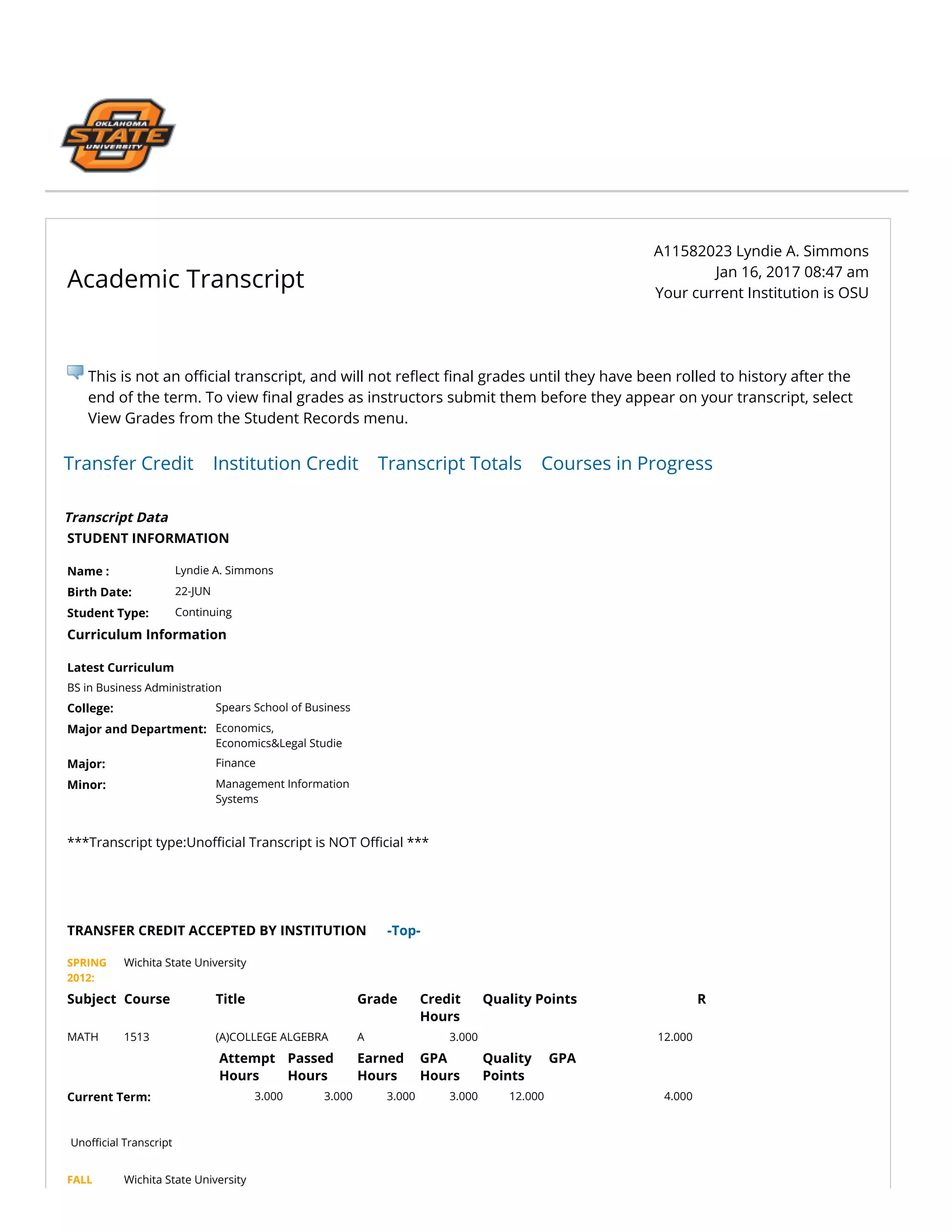 This unofficial transcript summarizes Lyndie A. Simmons' academic record. It shows that she has completed 144 credit hours between 2012-2016 at Wichita State University and Ohio State University, maintaining a cumulative GPA of 3.733. Her current course load in Spring 2017 includes 6 courses totaling 18 credit hours. The transcript provides details on her grades, honors, terms, and transferred credits from other institutions.