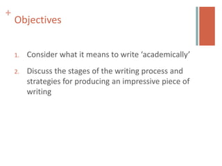 The document discusses the fundamentals of academic writing, emphasizing the importance of writing with clarity, structure, and critical engagement. It outlines the stages of the writing process, including planning, drafting, and editing, while also highlighting elements that characterize academic writing such as objectivity and formality. Additionally, it provides practical tips for writing effectively, including considerations for sentence and paragraph structure, as well as resources for further learning.