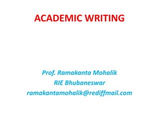 This document discusses academic writing. It defines academic writing as clear, concise, structured, and backed by evidence to aid reader understanding, using a formal tone. It lists common academic documents and describes their composition, including the IMRD structure of introduction, methods, results, and discussion. The document outlines key features of academic writing like appropriate referencing and avoiding plagiarism. It also discusses academic writing standards, plagiarism and how to avoid it, and copyright in academic works.