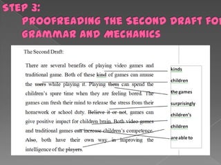 3) Writing a first draft following the outline without worrying about grammar.