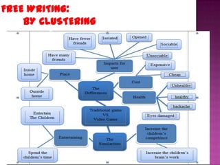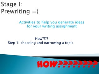 1) Choosing and narrowing a topic through brainstorming activities like listing and free writing.