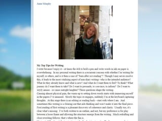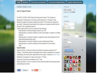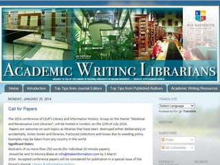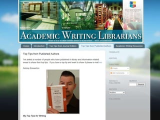 The document outlines resources and opportunities for promoting academic writing among library staff, including calls for publications, tips from authors and editors, and links to relevant articles and presentations. It provides insights into user engagement metrics, such as page views and geographical distribution. Additionally, it encourages following the associated blog and social media for updates and further resources.