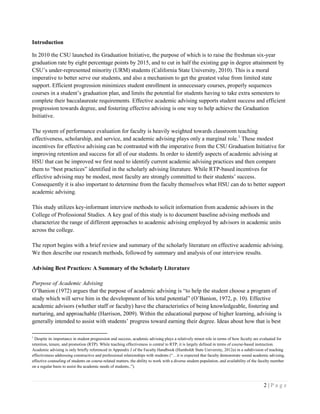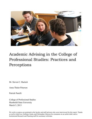 This document summarizes best practices in academic advising based on scholarly literature. It discusses the purpose of advising, models of advising, assessment of advising programs, and the connection between advising and student retention. It also outlines three main advising styles: prescriptive, developmental, and intrusive/proactive advising. The goal of the study is to document current advising practices in the College of Professional Studies at Humboldt State University and identify areas for improvement.