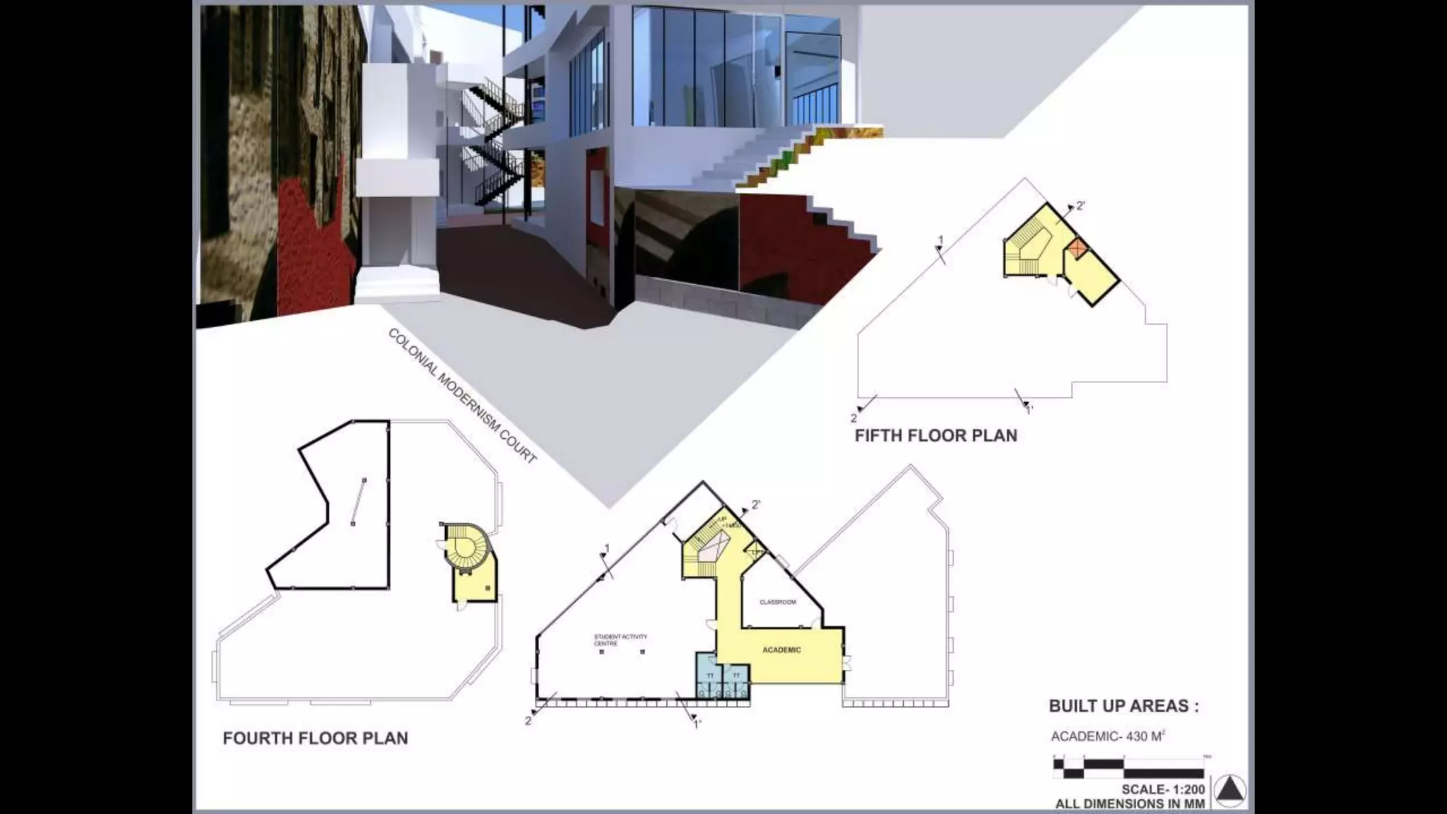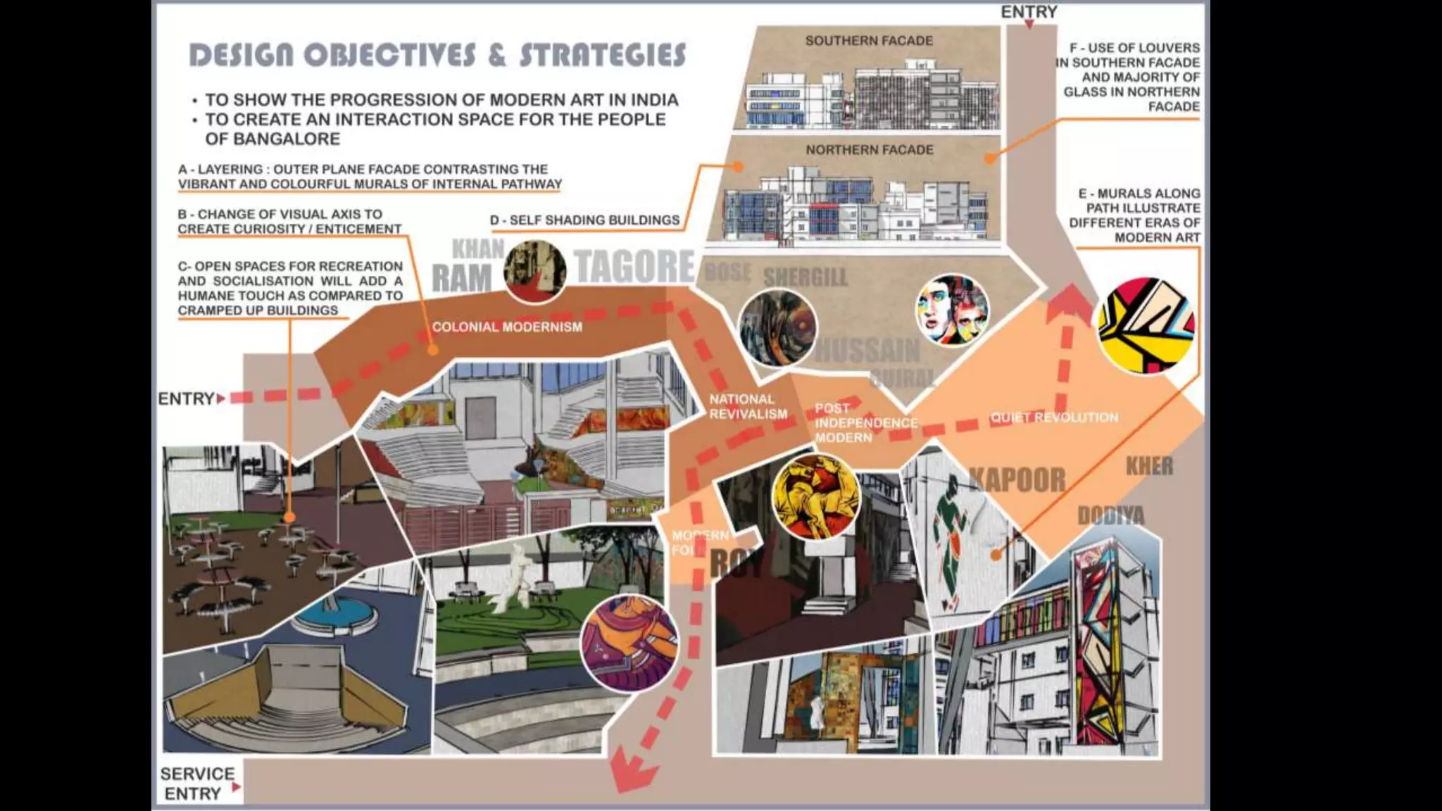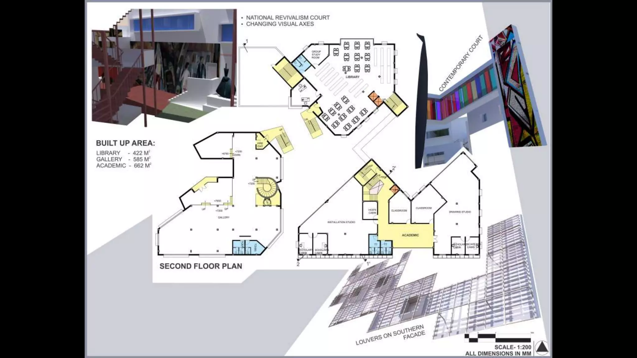 This document summarizes case studies and area programs for several art and museum projects in India. It includes details on the Kolkata Museum of Modern Art featuring stacked blocks and views from different levels. The Tribal Museum in Bhopal displays different tribes and cultures and was built by local people. It also provides area breakdowns for the components of a proposed Academy of Modern Art including education wings, studios, galleries, and administrative spaces. Site considerations and the progression of schematic designs are presented, culminating in ground floor plans and elevations.