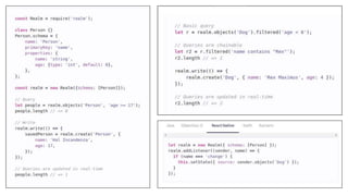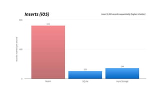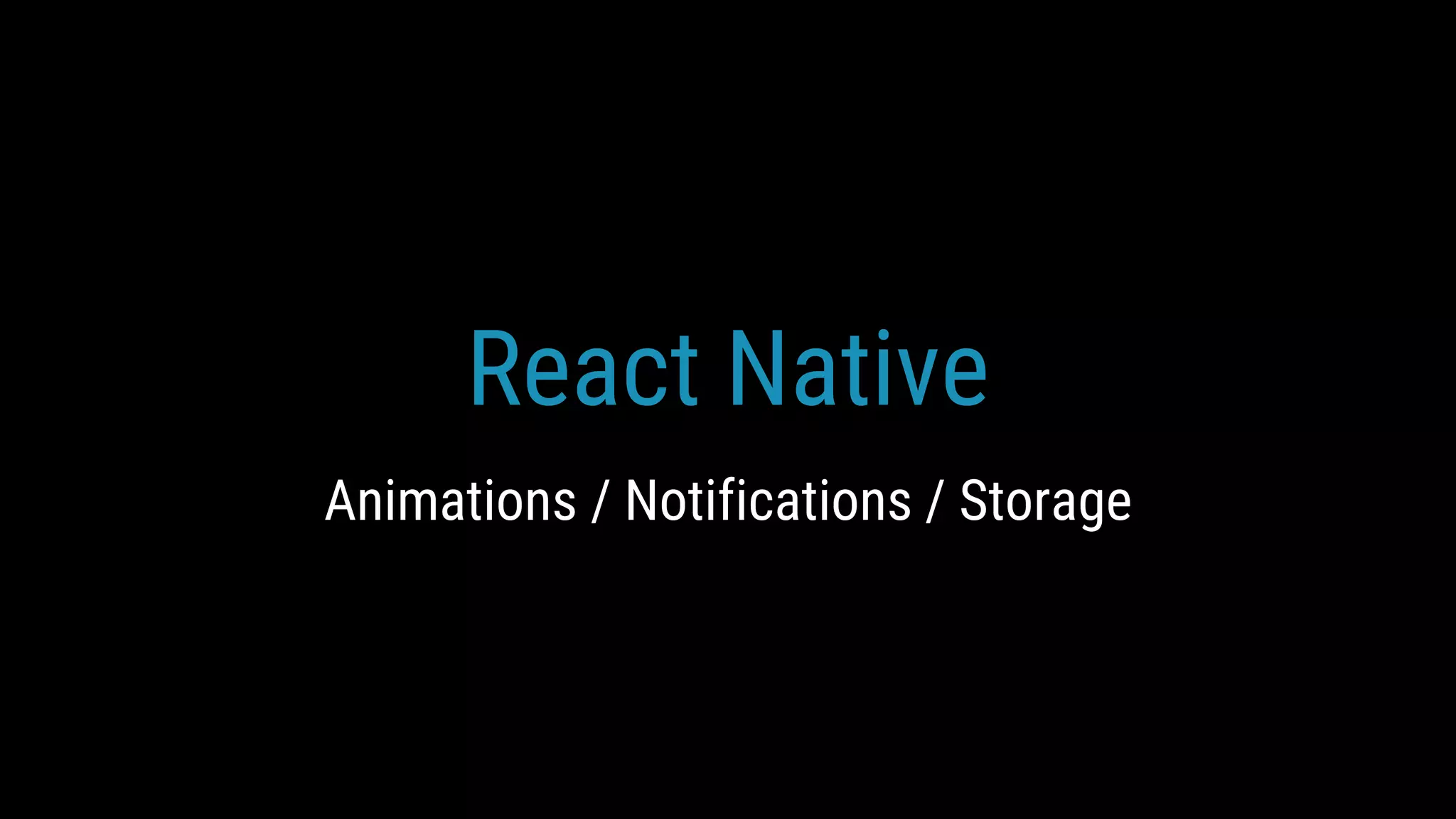 This document discusses various topics in React Native including animations, notifications, storage, and push notifications. It provides code examples for using pan responders and gestures to handle touches, creating websockets using Socket.io or native code, different types of animations like timing and spring, and accessing async storage on Android and iOS. It also covers using AppState to detect app state changes and sending local and scheduled push notifications.