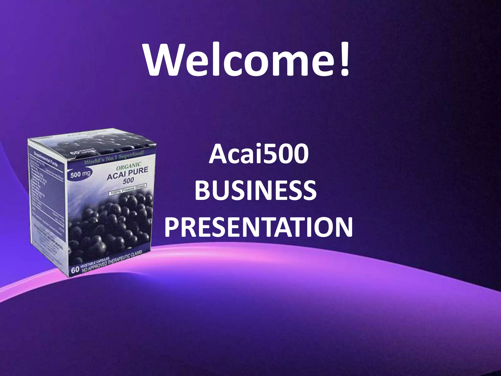 This document introduces the Acai500 business and its acai berry product. It summarizes the health benefits of acai berries, which include promoting weight loss, reducing aging effects, and strengthening the heart. It then describes the compensation plan for becoming an Acai500 distributor and earning commissions on product sales and new recruits. Distributors can earn up to 10,000 pesos daily by pairing new recruits and product purchases from their groups.