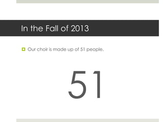 The summary of the document is: The choir director outlines how membership in the school's a cappella choir will decline sharply from 51 members to just 7 by 2016 due to graduating seniors, with only one member (Micheal Megginson) remaining by 2017. They request help from current choir members to recruit more male singers, especially baritones and basses, to join in the following years to save the choir program.