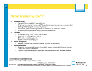 The document describes Nationwide's Agency Capital Builder (ACB) Employee Agent Program. It discusses Nationwide's industry leadership, stability, and brand recognition. Nationwide values people, customers, honesty and integrity, teamwork, accountability, and results. The ACB program offers targets for annual compensation, capital funds, and bonuses for new agents located in metro or rural areas, with seeds of existing business or starting from scratch.