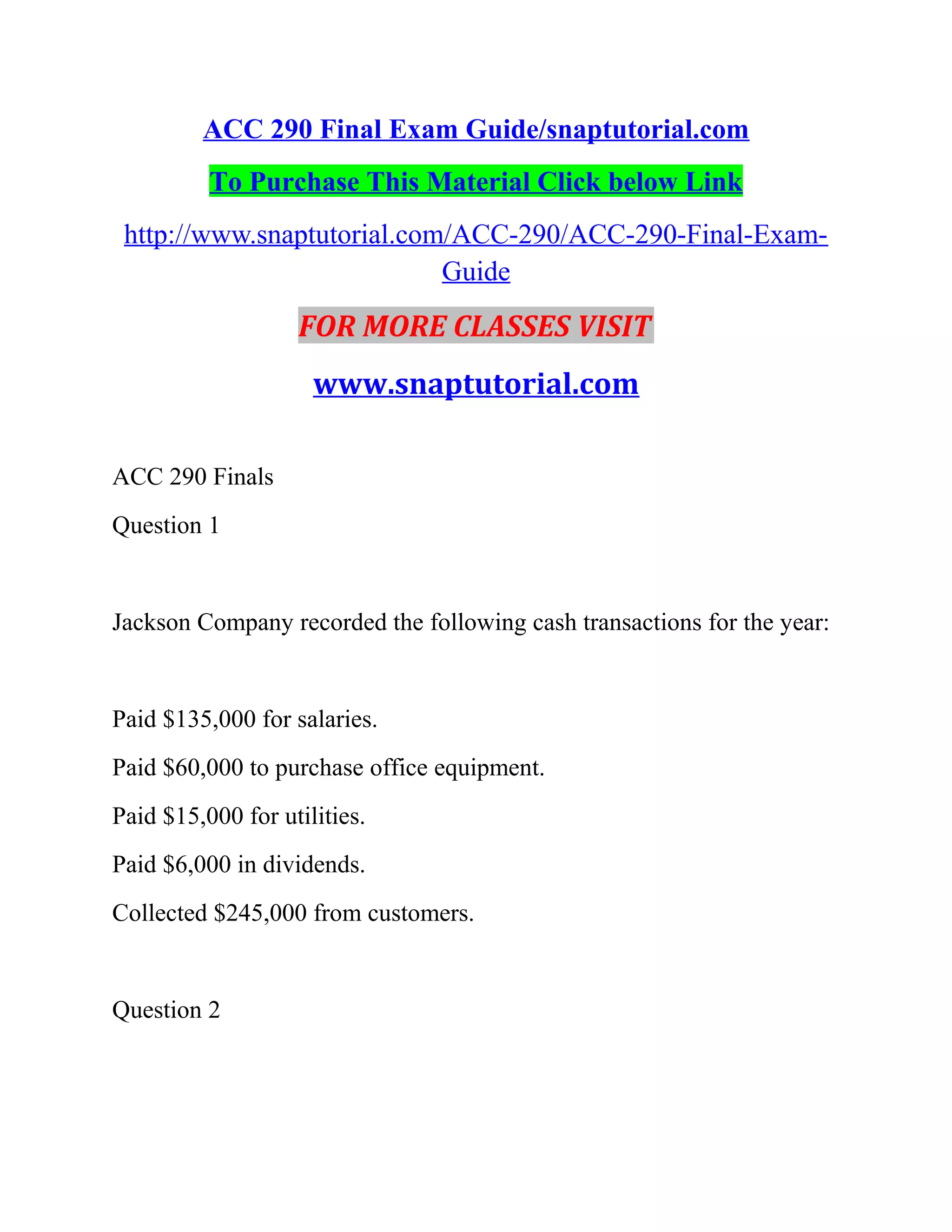 This document provides a guide for the ACC 290 Final Exam with 30 multiple choice questions covering topics like accounting transactions, inventory valuation methods, adjusting entries, internal controls, and financial statements. It also provides a link to purchase the full exam preparation material.
