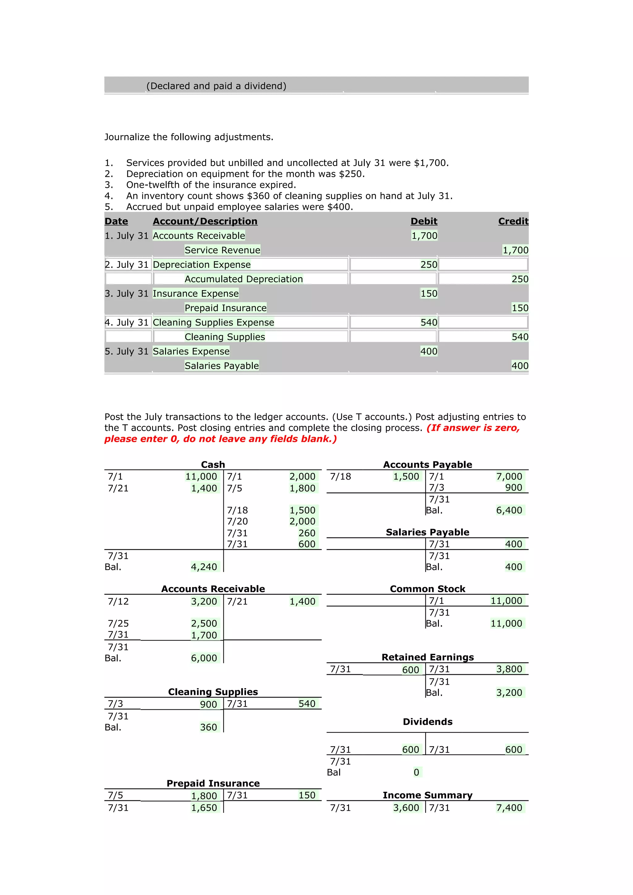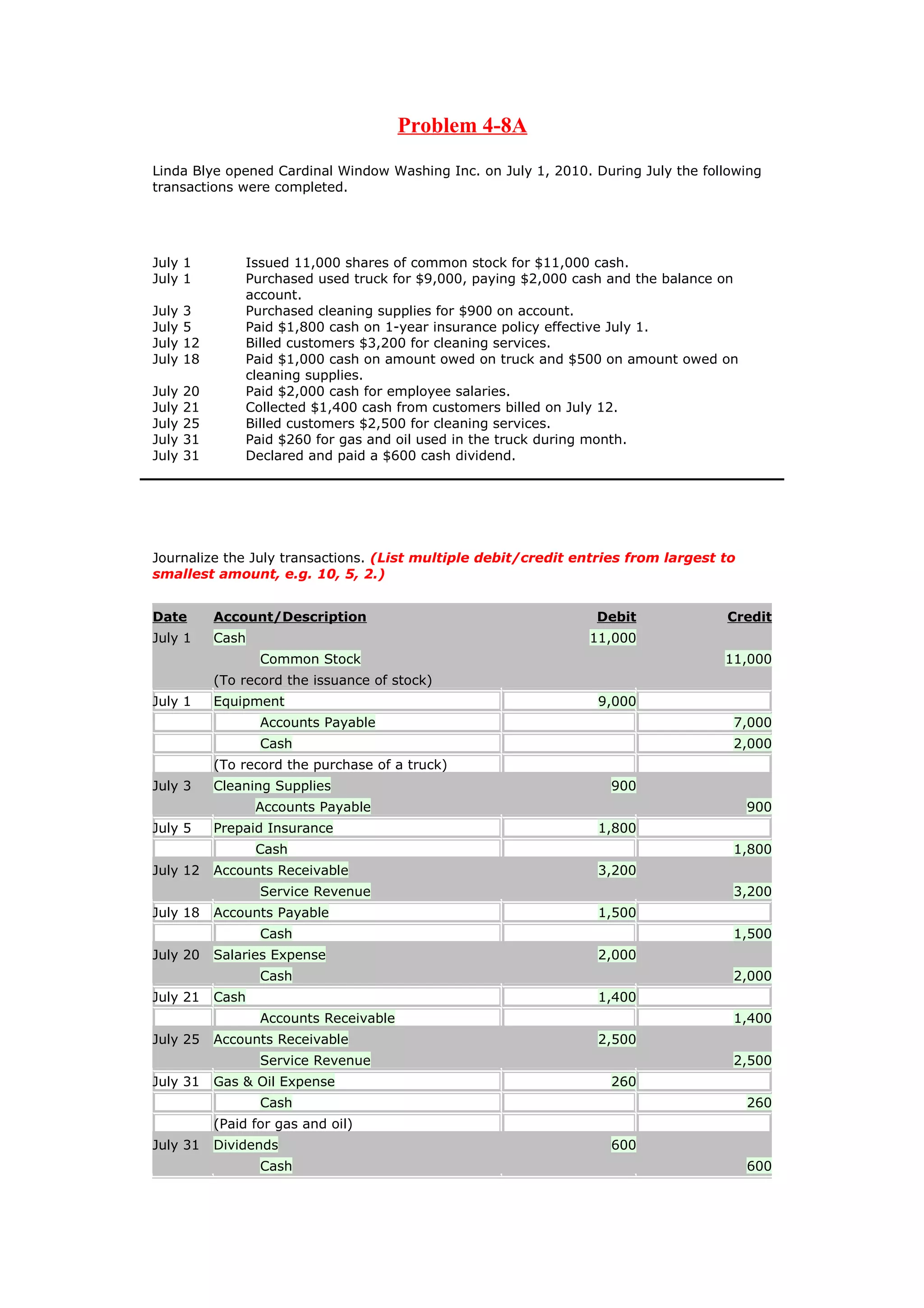Cardinal Window Washing Inc. recorded various business transactions during July 2010, including issuing stock, purchasing a truck, billing and collecting from customers, paying expenses, and declaring a dividend. Net income for the month was $3,800. Post-closing entries closed revenue and expense accounts to the income summary account and dividends account to retained earnings. The adjusted trial balance and financial statements were completed.