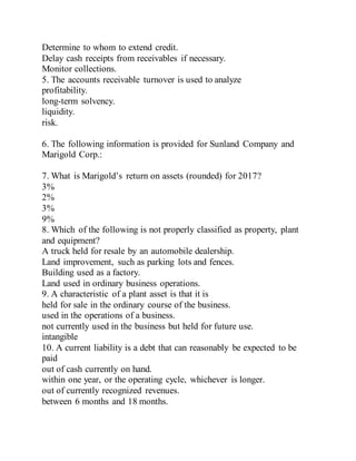 The document outlines various accounting concepts and exercises related to accounts receivable, liabilities, and financial statement analysis for courses ACC 291. Key topics include the management of receivables, performance ratios, depreciation methods, and specific assignments requiring detailed calculations and journal entries. Additionally, it mentions various companies for case studies and examples to illustrate the principles of financial accounting.