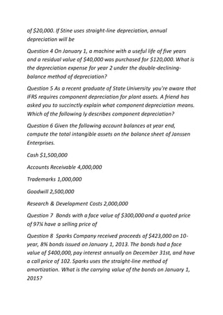 The document is a comprehensive guide for ACC 291, containing various accounting questions and scenarios related to financial management, asset depreciation methods, and financial reporting standards. It addresses topics such as accounts receivable, intangible assets, bond issuance, and cash flow reporting. Additionally, it references online resources for further educational materials on the subject.