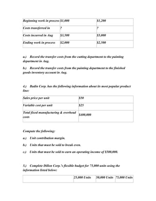 This document provides a sample ACC 400 final exam with 20 multiple choice questions covering various accounting topics such as cost accounting, financial statement analysis, internal controls, receivables, and equity. The exam questions assess understanding of accounting concepts like operating cycles, cash budgets, plant asset exchanges, bad debt expense, and accounting for dividends.