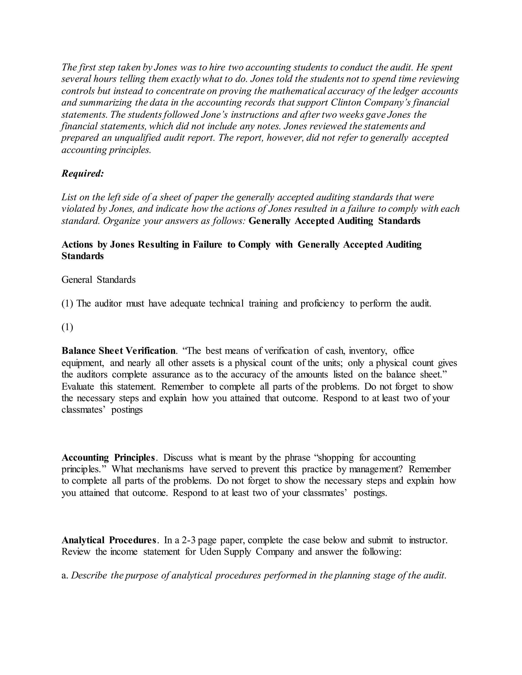 The material asks students to evaluate statements, analyze case studies, describe audit processes, and discuss standards in order to demonstrate understanding of fundamental auditing concepts. Students are also instructed to respond to classmates' postings on the various discussion