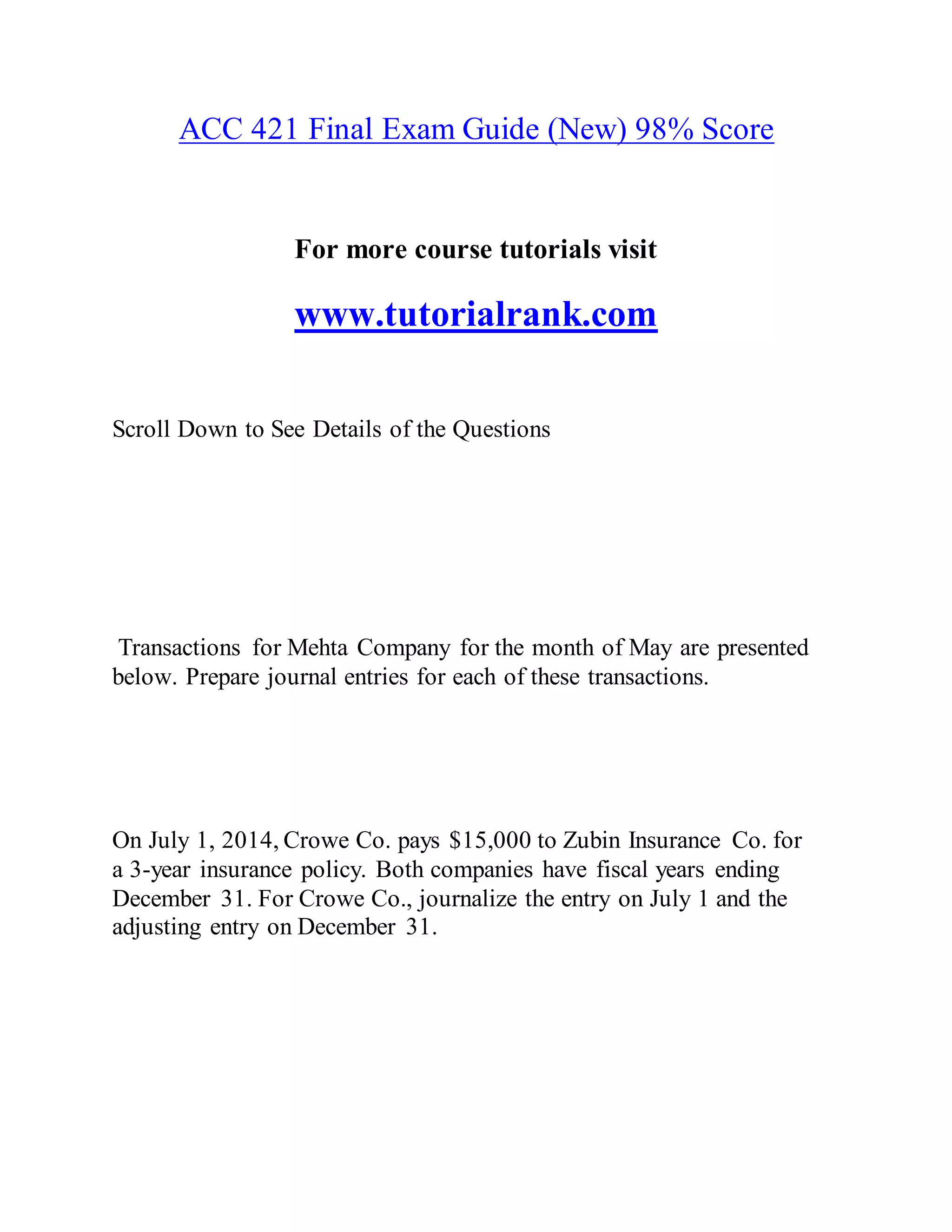 The document provides a comprehensive collection of accounting exercises and problems for an ACC 421 final exam. It includes detailed scenarios involving various transactions, financial statements, adjusting journal entries, and revenue recognition principles for multiple companies. The exercises are designed to help students practice and understand accounting concepts such as accrual accounting, payroll entries, closing entries, and cash flow statements.