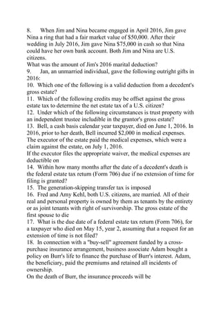 The document is a study guide covering various tax scenarios and regulations including gift tax exclusions, estate tax rules, and personal income tax deductions. It outlines examples involving individuals' financial transactions, property valuations, and tax filing implications. Moreover, it discusses concepts related to primary and secondary tax sources, personal and business tax filings, and scenarios for asset management after death.