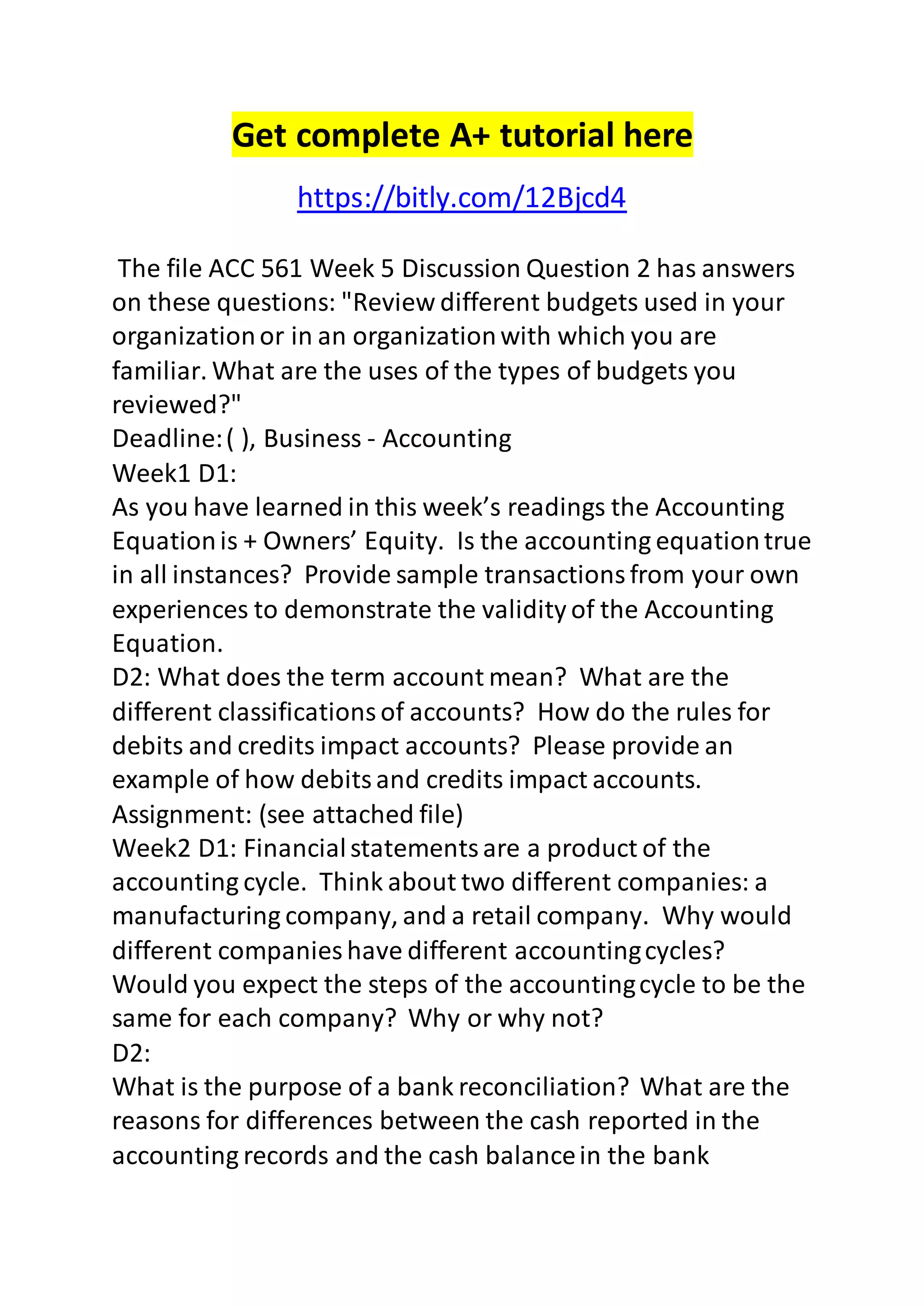 This document contains discussion questions and assignments for an accounting course across 5 weeks. It includes questions about the accounting equation, different types of accounts and how debits and credits impact them. It also addresses budgets, bank reconciliations, inventory costing methods, depreciation, current and long-term liabilities, ratio analysis, and recommendations for business entity types. The final assignment involves a five to seven page financial statement analysis of a public company.