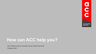The Association of Communication Companies (ACC) provides several services and tools to unite, empower, and support its member agencies. The ACC works to regulate the industry, stimulate collaboration and education, and investigate issues impacting agencies. Key initiatives include developing standard contracts and guidelines, organizing training and networking events, benchmarking agency performance, and advocating for the creative industry.