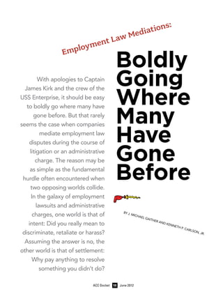 The document discusses considerations for companies when mediating employment law disputes. It notes that mediation provides an opportunity to objectively assess case strengths, weaknesses, risks, and costs of continuing litigation, which can lead to settlement. However, mediation does not require settlement. The document outlines factors that can increase the likelihood of settlement through mediation, including selecting an experienced mediator, having appropriate representatives present, and mediating at different stages of litigation, each with their own dynamics. Early mediation before positions harden is discussed as one option that can motivate companies seeking a quick resolution.