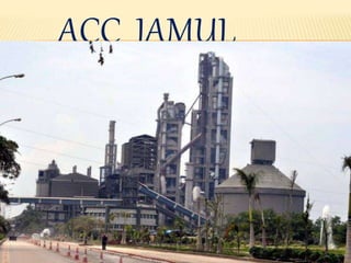 ACC Limited is one of the largest cement producers in India, established in 1963. The document discusses the cement manufacturing process at ACC. It involves blasting raw materials like limestone and clay from quarries, crushing and transporting them to the plant. The raw materials are finely ground to produce the raw mix, which is preheated and burned in a kiln at 1500°C to produce clinker. The clinker is then ground with gypsum and other additives to produce pure cement. Finally, the cement is stored in silos before being packed and dispatched.