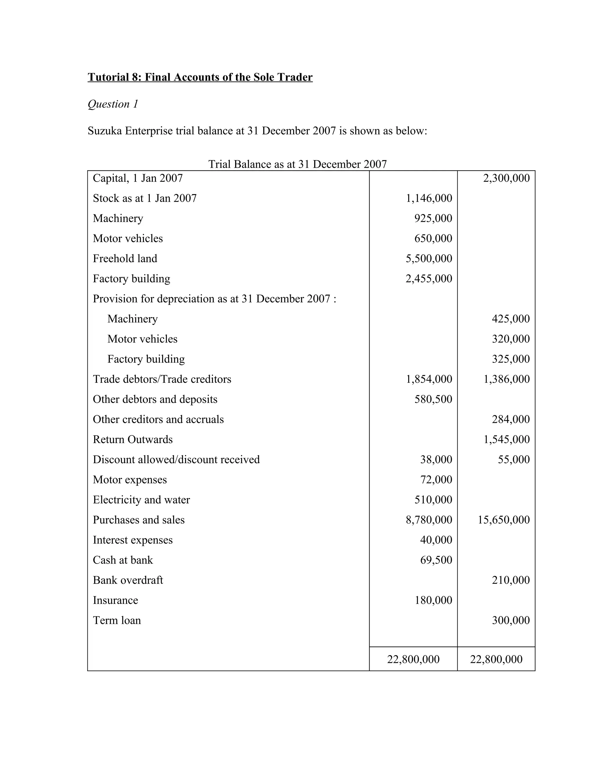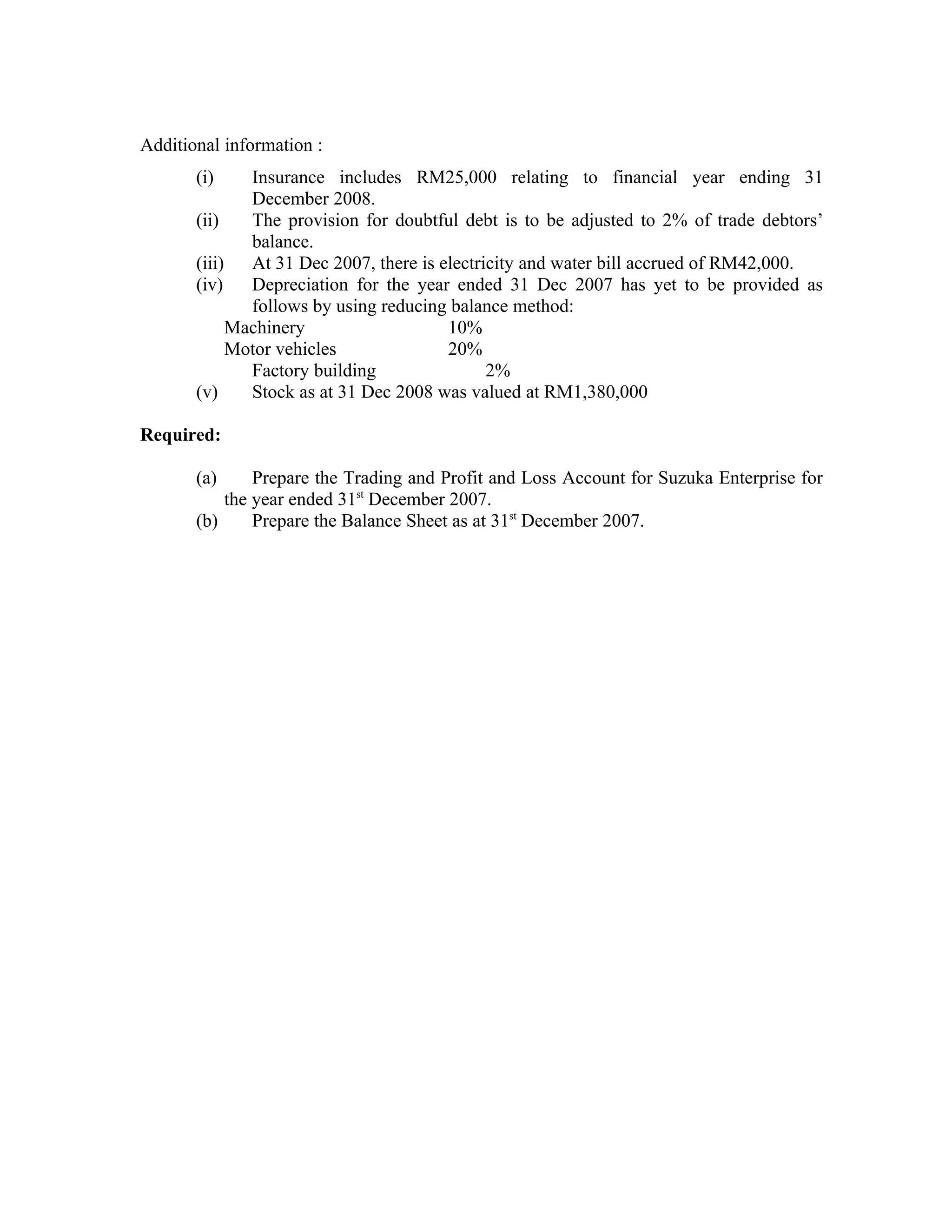 Suzuka Enterprise's trial balance as of December 31, 2007 is provided. Additional information includes adjustments needed for insurance, provision for doubtful debts, accrued expenses, and depreciation calculations. The required tasks are to [1] prepare the Trading and Profit and Loss Account for the year ended December 31, 2007 and [2] prepare the Balance Sheet as of December 31, 2007 using the information provided.