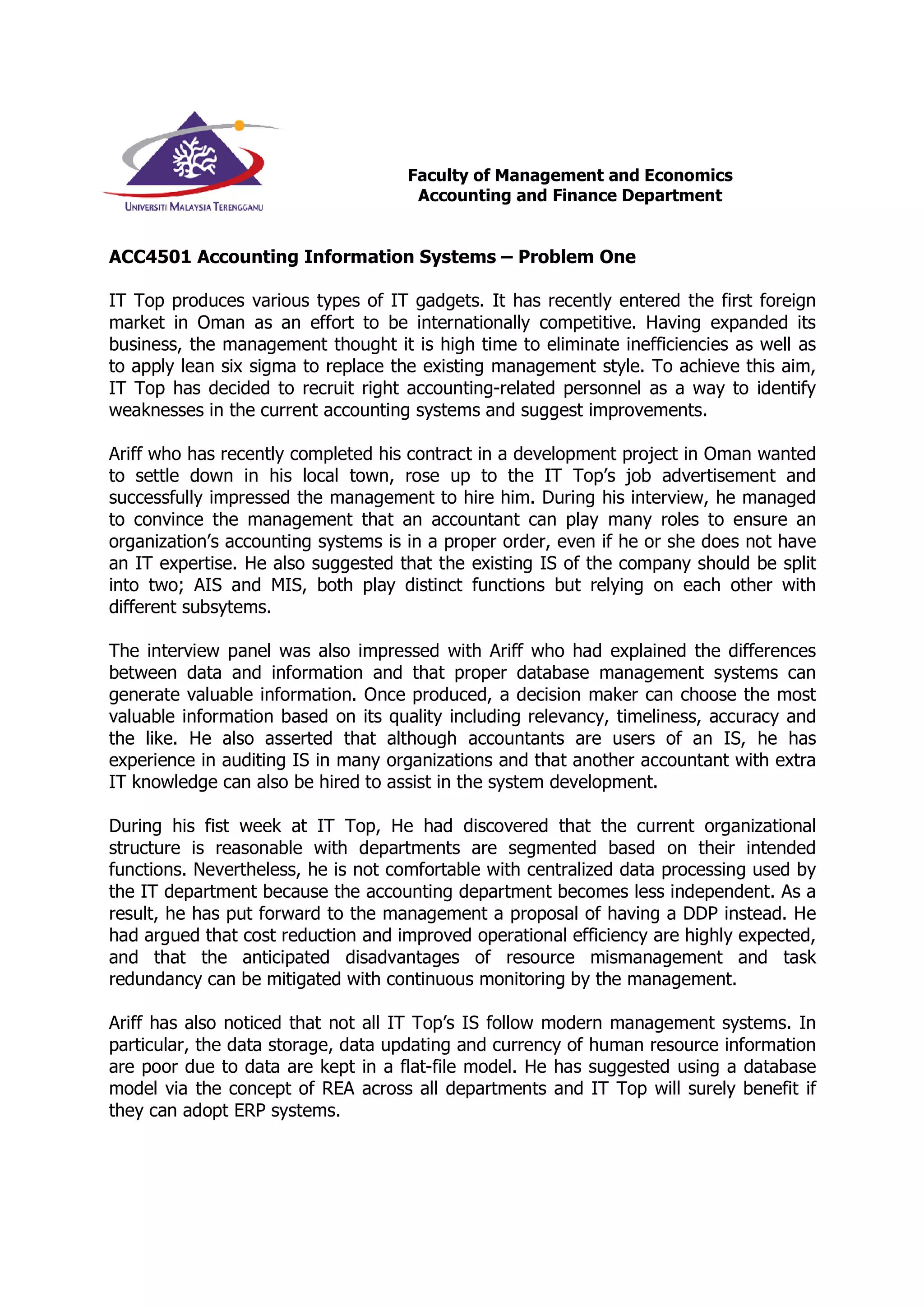 1. Ariff was hired by IT Top, an IT company expanding internationally, to identify weaknesses in their accounting systems and suggest improvements.