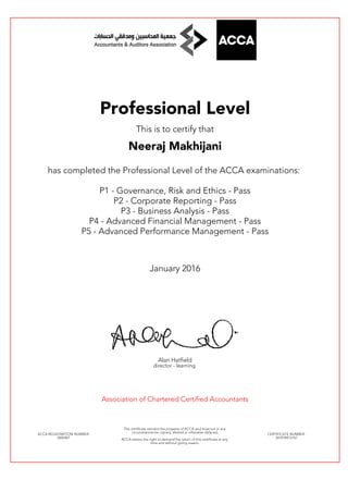 Neeraj Makhijani has completed the professional level of examinations for the Association of Chartered Certified Accountants (ACCA). He passed exams P1 through P5, which cover topics like governance, risk, ethics, corporate reporting, business analysis, financial management, and performance management. The certificate, issued in January 2016 by ACCA director Alan Hatfield, certifies Neeraj Makhijani's completion of the professional level and includes his ACCA registration number and certificate number.