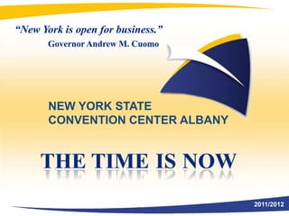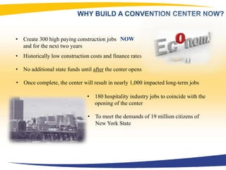 The document proposes building a new convention center in Albany, New York to boost the local economy. It argues that now is the time to build due to low construction costs and a need to accommodate 19 million state residents. The center would create hundreds of construction jobs and nearly 1,000 permanent jobs. It cites examples from other cities where convention centers generated millions in visitor spending, new hotels and restaurants, and increased tax revenue. Meeting planners support the plan which includes exhibition space, a ballroom, and connections to local transportation. The goal is to make Albany a hub for conferences, tourism, and economic development.