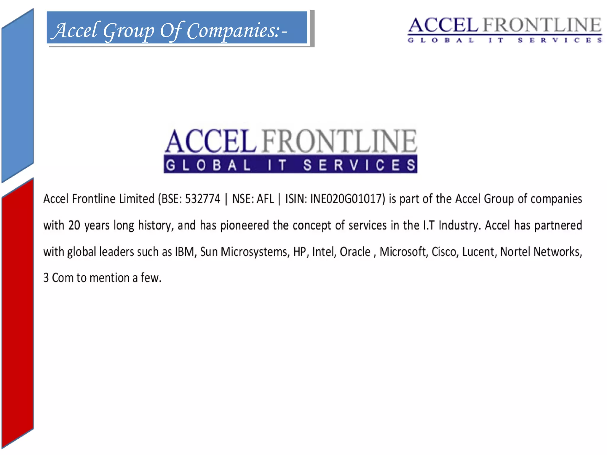 Accel Frontline Services merged with Accel Frontline Ltd effective April 1, 2011 in order to consolidate group entities and expand value-added services. This merger brought synergies to AFL's existing IT infrastructure management services in India and was expected to increase profit margins. In fiscal year 2012, AFL posted consolidated annual revenue of Rs. 421.92 crores, up 6.87% from the previous year. Revenue for the fourth quarter was Rs. 124.23 crores, up 69% from the previous quarter.