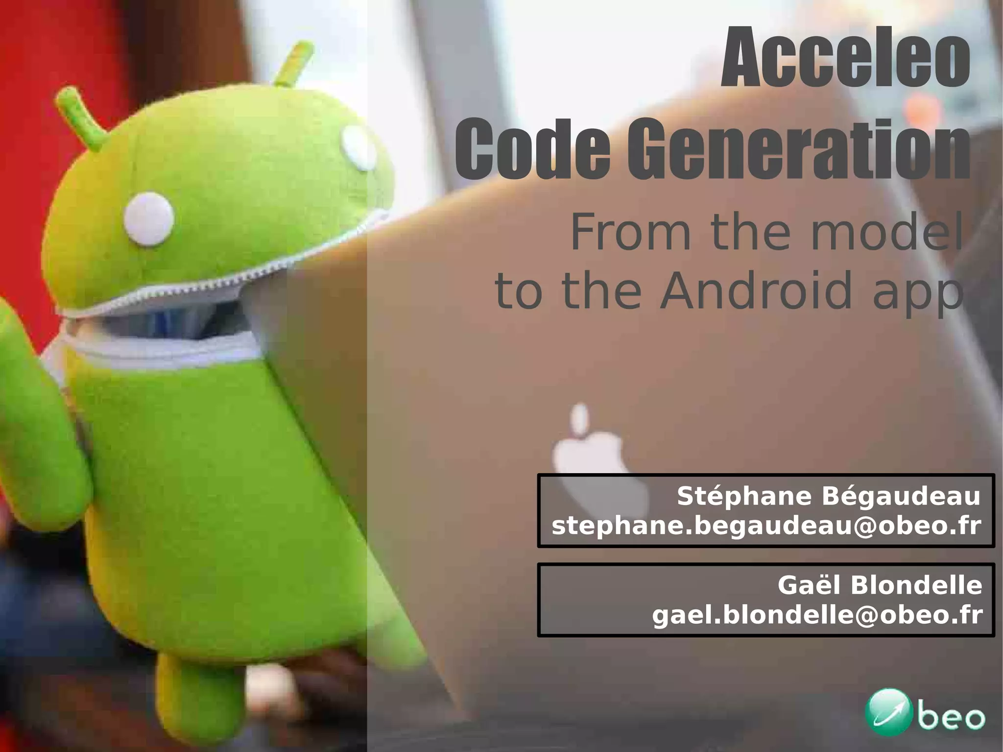 The document discusses Acceleo, a code generation tool from Eclipse. It provides an overview of Acceleo's history and capabilities. Key points include: (1) Acceleo allows generating code from models using templates based on the MTL standard; (2) A prototype demonstrates generating an Android app from a model using Acceleo templates; (3) Templates can be customized and extended to override default generation behavior. The tutorial aims to help beginners, experienced Acceleo users, and Android developers learn how to build code generators with Acceleo.