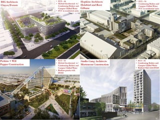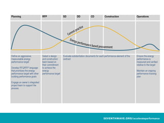The document discusses performance-based procurement for building projects. It provides examples of how owners can define project goals and energy targets to guide design teams. Key aspects include categorizing goals as mission critical, highly desirable, or possible; setting clear and adjustable energy use targets; and establishing modeling guidelines and schedules for design teams to validate performance goals are met. The intent is to accelerate high performance building outcomes through the procurement process.