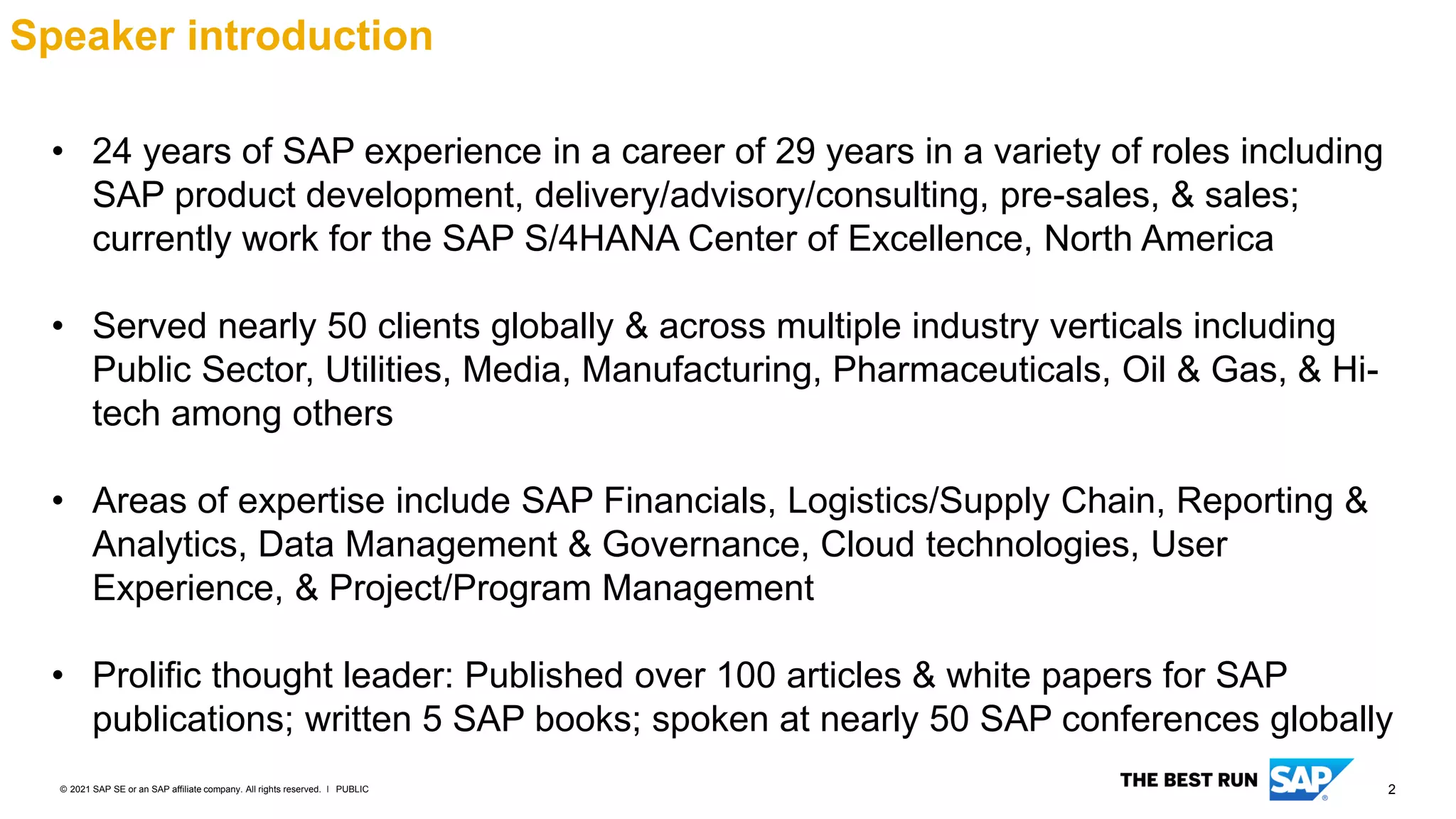 The document outlines SAP's approach to transforming businesses with its 'Rise with SAP' initiative, emphasizing the importance of digital transformation across varying company stages. It discusses the comprehensive cloud ERP offering, including components such as business process intelligence, analytics, and outcome-driven services, aimed at improving operational efficiency and sustainability. Additionally, it highlights the need for companies to adapt and innovate amidst current technological trends to remain competitive.