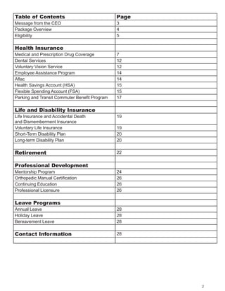 The document provides information about employee benefits offered by Accelerated Rehabilitation Centers, including: