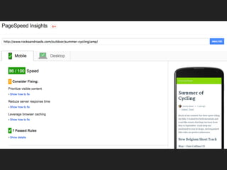 The document outlines Accelerated Mobile Pages (AMP), an open-source initiative designed to create fast-loading web pages for mobile devices. It consists of three main components: AMP HTML, AMP JS, and Google AMP Cache, which work together to enhance user experience and performance. The document also provides guidance on implementation, validation, and available resources for users looking to adopt AMP.