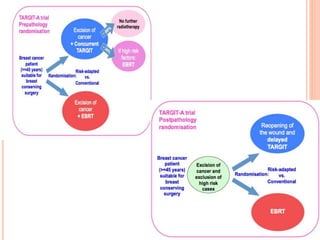 Accelerated partial breast irradiation (APBI) delivers radiation to only the portion of the breast at highest risk of recurrence rather than the whole breast. This allows radiation to be delivered in a significantly shortened period. Several techniques for APBI exist including brachytherapy using catheters implanted in the breast, balloon brachytherapy, and external beam radiotherapy. Ongoing clinical trials are evaluating outcomes and toxicities of APBI compared to whole breast irradiation in appropriately selected patients with early-stage breast cancer.