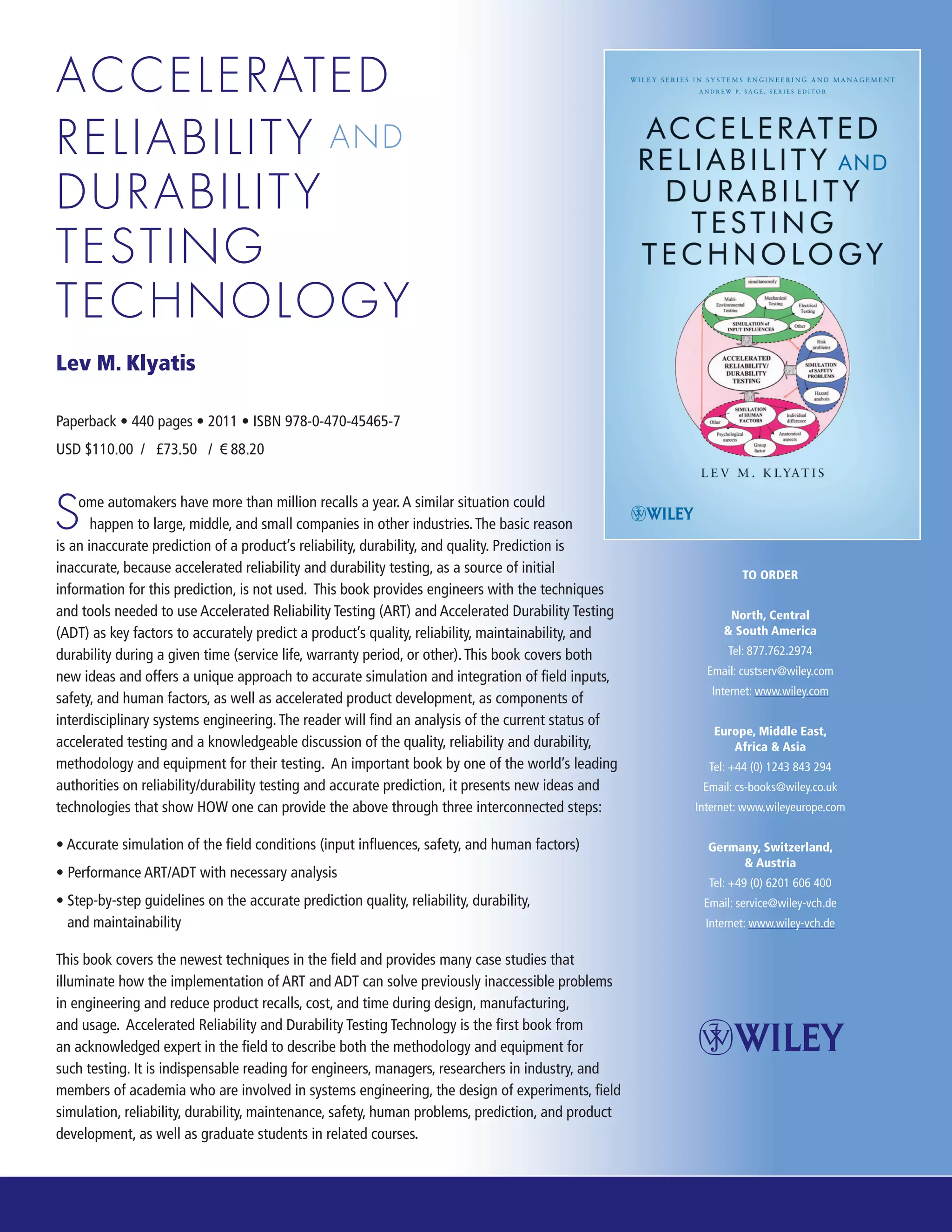 The book 'Accelerated Reliability and Durability Testing Technology' by Lev M. Klyatis outlines techniques and tools for engineers to accurately predict product quality, reliability, maintainability, and durability through accelerated reliability and durability testing (ART and ADT). It addresses the critical need for improved testing methodologies, presents new ideas and technologies, and provides case studies to showcase practical applications. The content is relevant for engineers, managers, researchers, and students involved in systems engineering and product development.