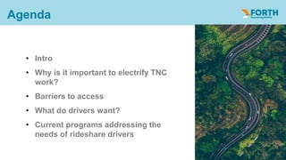 Ian Sergeant, program manager for Forth’s access to cars team, focuses on facilitating the transition of transportation network company (TNC) drivers to electric vehicles (EVs), particularly for low- and moderate-income earners. Key barriers include limited access to financing and credit for predominantly marginalized gig drivers, despite the economic benefits of EVs. The document discusses current partnerships and comprehensive solutions aimed at increasing EV adoption among these drivers through financial assistance, education, and improved infrastructure.