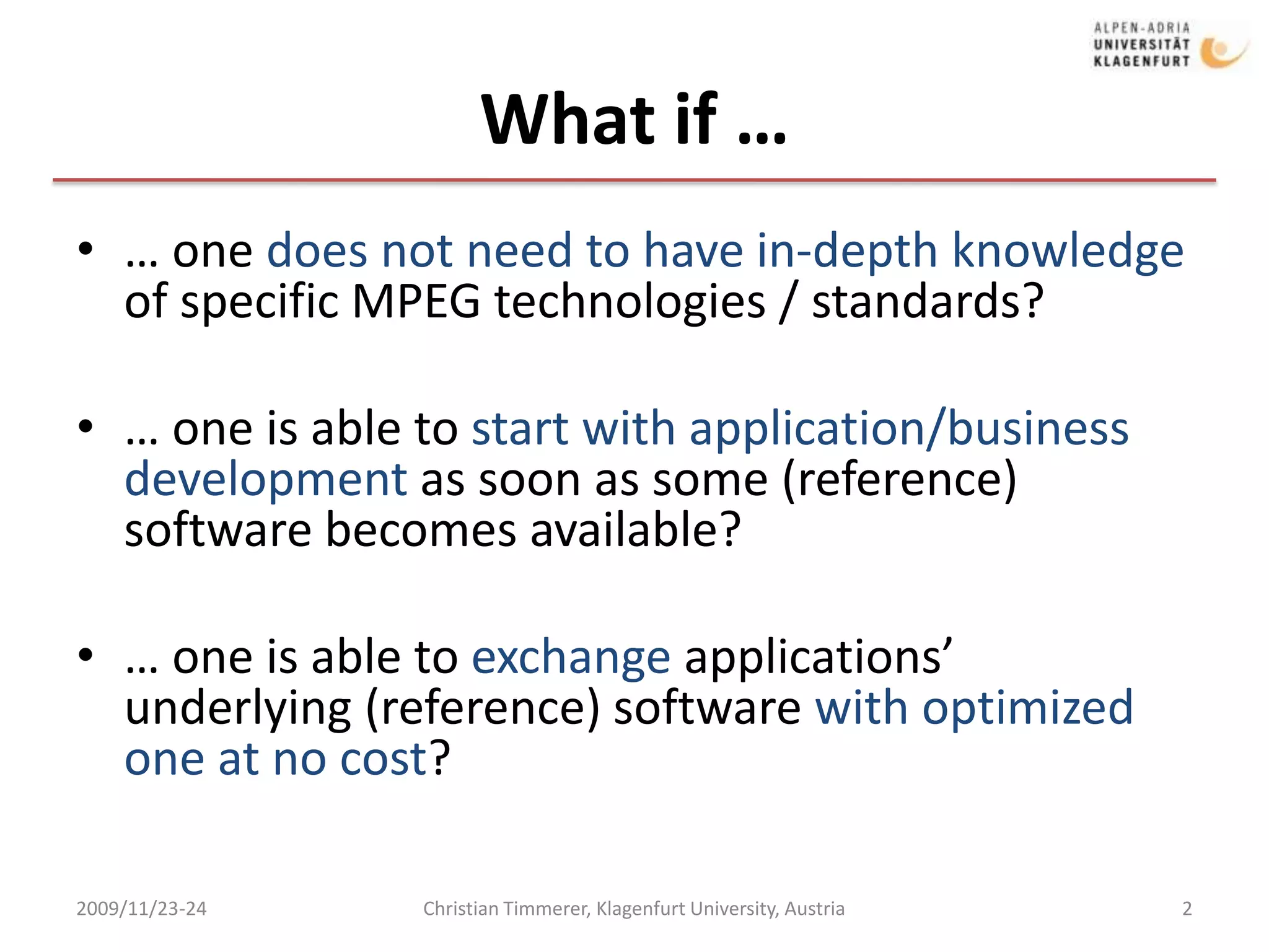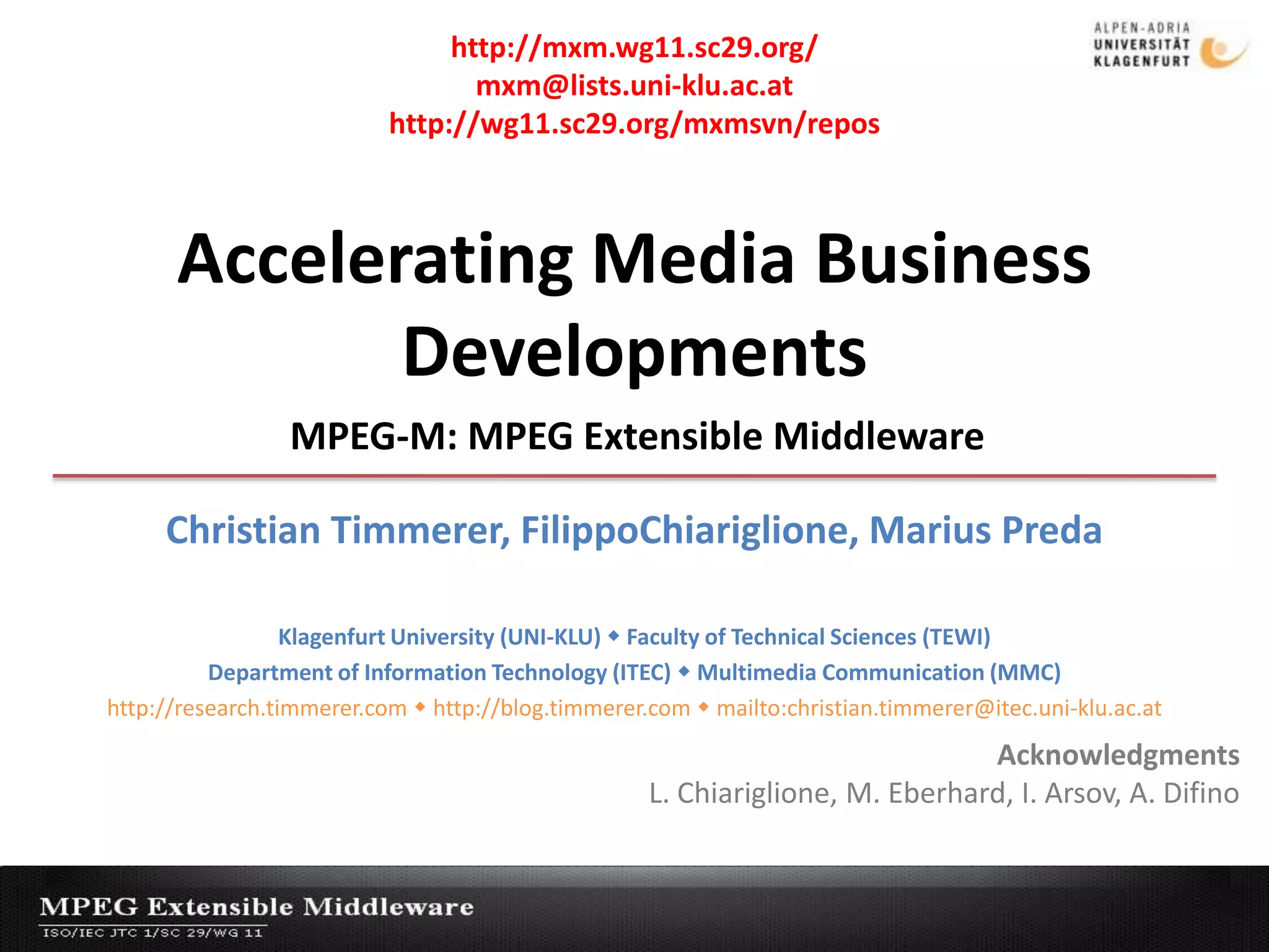 This document introduces MPEG-M (MPEG Extensible Middleware), which provides a standardized set of APIs to access various MPEG technologies through "engines". The MXM APIs simplify application development by hiding the complexity of MPEG standards. The MXM architecture includes engines for MPEG-21, MPEG-4, IPMP, and other technologies. Applications can access these engines through simple MXM API calls to perform tasks like streaming media, including 3D graphics, and sharing protected content. The goal of MXM is to accelerate media business by providing a common platform and set of protocols for distributed multimedia applications and services.