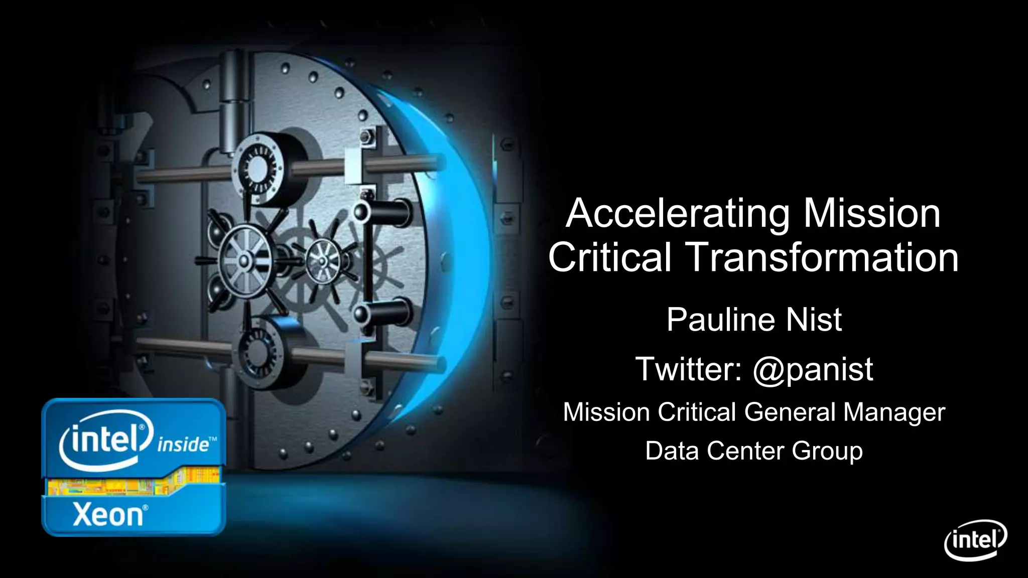 This document discusses accelerating mission critical workloads by migrating them from legacy and proprietary systems to open standard x86 platforms based on Intel Xeon processors. It provides an overview of how Intel is enabling this transition through improved performance, reliability, and security features in recent Xeon generations, as well as growing ecosystem support. Analyst reports and customer quotes are presented showing the migration of mission critical workloads from RISC/UNIX platforms to Xeon, driven by lower costs and comparable capabilities.
