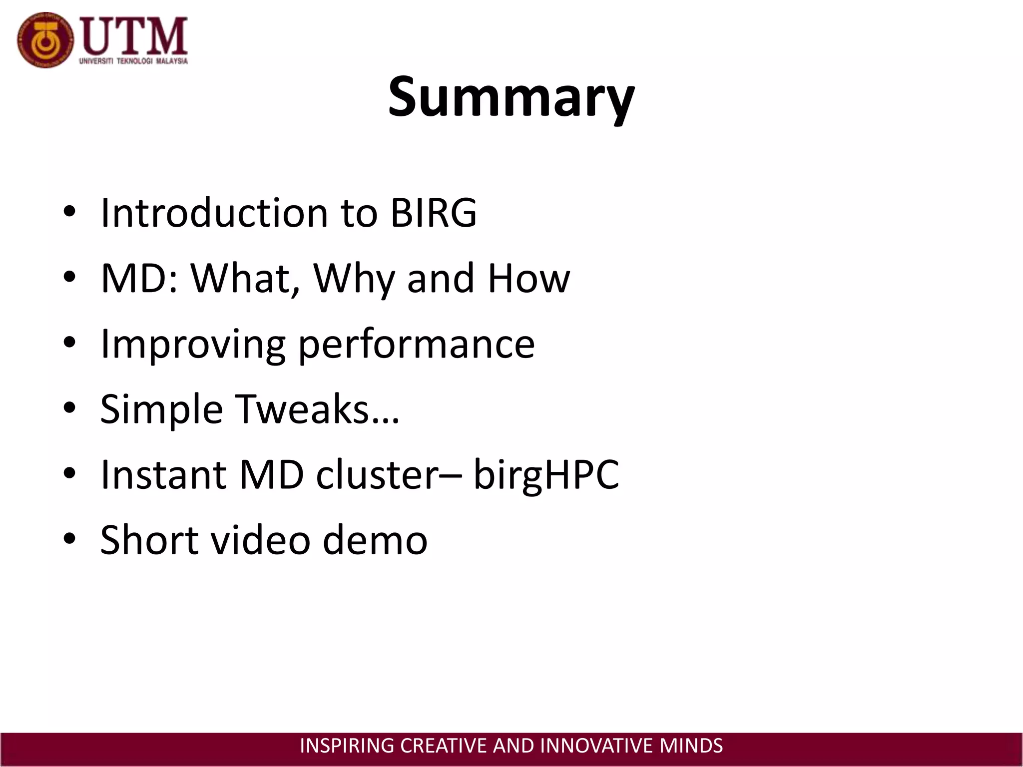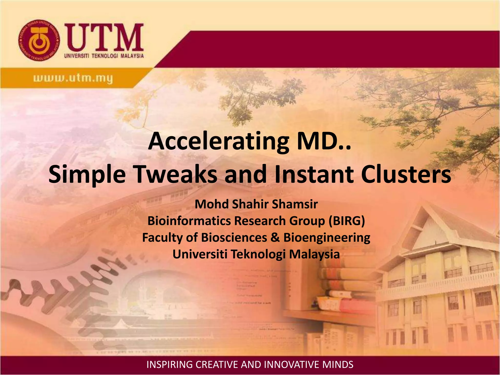 This document discusses using existing idle computers to create an instant computing cluster for molecular dynamics (MD) simulations called birgHPC. It describes how birgHPC is a Linux distribution that allows various computers connected via LAN to be automatically configured as a computing cluster with tools for MD, bioinformatics and monitoring. Simple instructions and screenshots are provided on setting up and using birgHPC to perform MD simulations using idle computers with no additional cost.