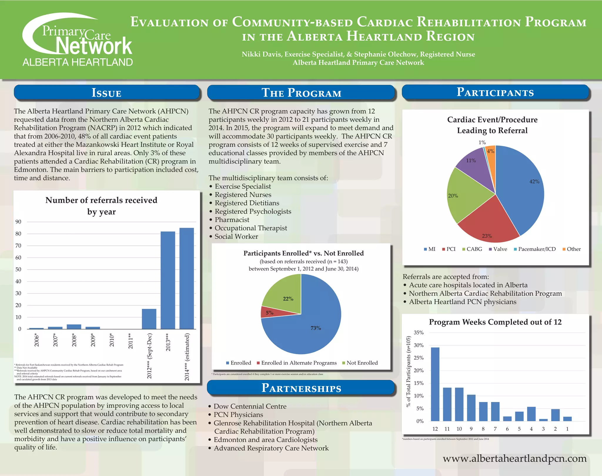 The AHPCN CR program was developed to improve access to cardiac rehabilitation services for residents in rural Alberta and increase participation rates, as prior to 2012 only 3% of cardiac patients from the region utilized the program in Edmonton despite 48% of cardiac patients living rurally. The program has grown from serving 12 participants weekly in 2012 to 30 participants weekly by 2015, offering both supervised exercise and educational classes delivered by a multidisciplinary team. Referrals have increased each year since the program began from rural hospitals, cardiac programs, and local physicians to better serve residents and support secondary prevention of heart disease.