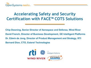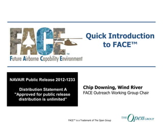 The document discusses the Future Airborne Capability Environment (FACE) initiative, which provides an open architecture for rapid software deployment and interoperability across military platforms. It highlights the benefits of using FACE's conformant software and safety/security evidence to accelerate military program development and reduce costs. The FACE consortium, formed in 2010, comprises various industry and government organizations, and aims to improve software reuse and integrate legacy and future systems.
