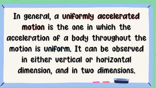 The document outlines a lesson plan focused on uniformly accelerated motion (UAM) and its application in sports. It defines acceleration as the rate of change in velocity and includes objectives, activities, and quizzes to assess understanding. Additionally, it provides examples and calculations related to UAM in practical scenarios.