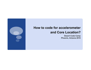 The document discusses how to code for accelerometer and Core Location in Objective-C. It provides code snippets for reading accelerometer data using UIAccelerometer and handling orientation changes. It also explains how to get the user's current location using the Core Location framework by initializing a CLLocationManager instance and setting a delegate to receive location updates.