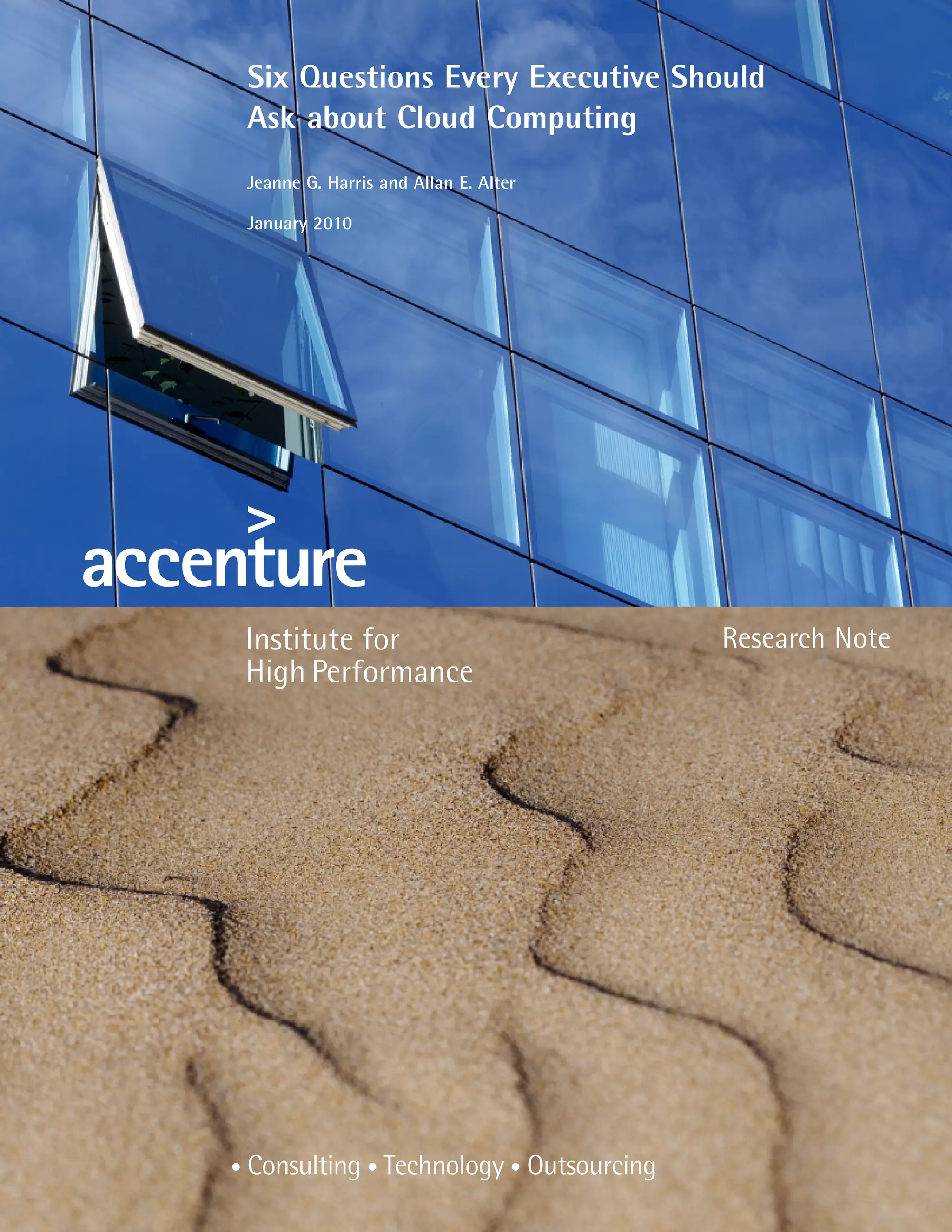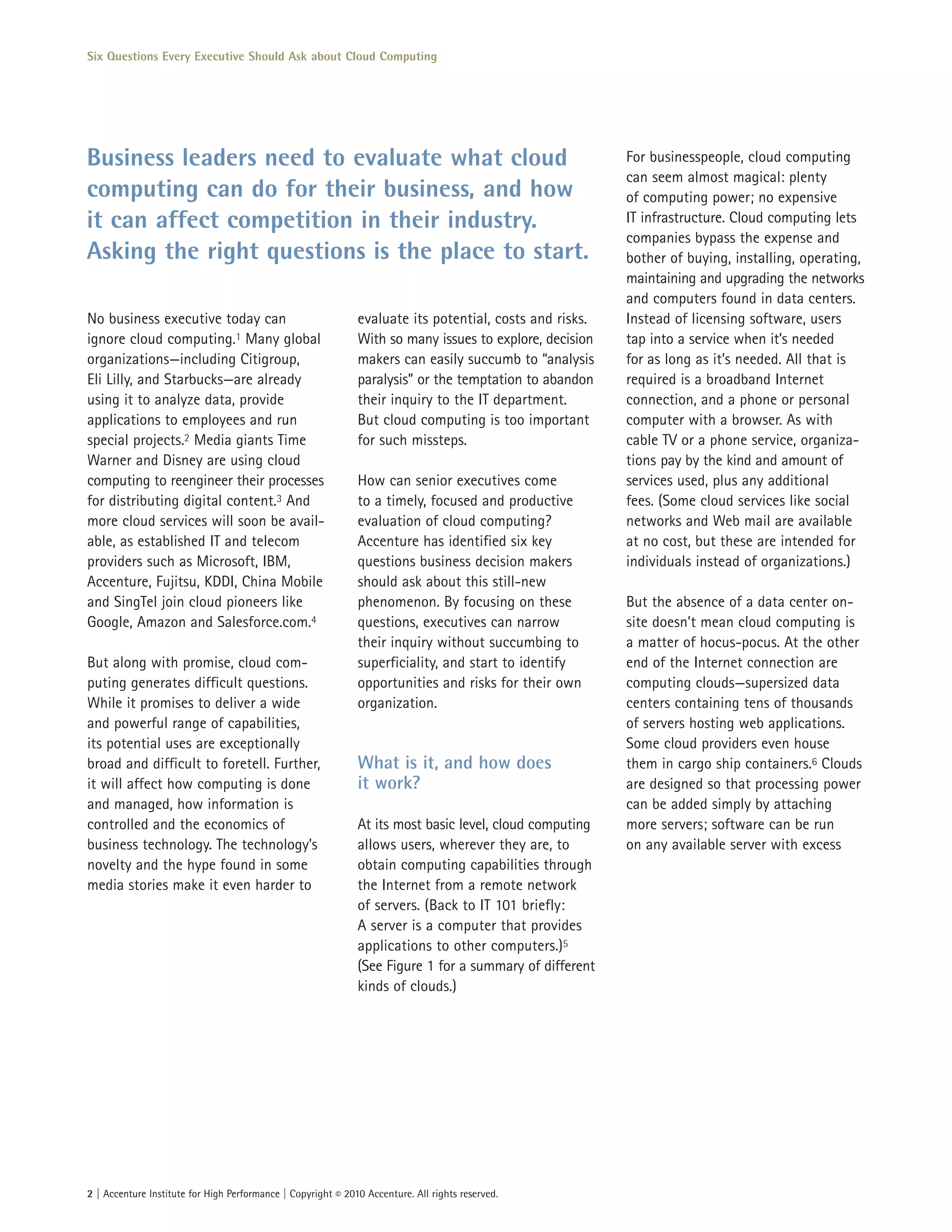 This document discusses six key questions that business executives should ask about cloud computing. The questions are: 1) What is it, and how does it work? 2) What specific benefits can clouds bring to my organization? 3) Can I depend on clouds to save my organization money? 4) How will clouds affect the way my organization competes? 5) What risks must my organization manage? By focusing on these questions, executives can evaluate cloud computing's opportunities and risks for their own organization in a timely and productive way.