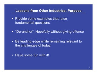 This document discusses lessons that healthcare can learn from other industries in transforming costs and delivery. It provides three case studies of initiatives in Canada that have improved quality, access, and value through centers of excellence in cataracts, diagnostic imaging, and genomic sequencing. While total healthcare spending is rising, the document argues that unit costs for many procedures and technologies are actually declining over time. It suggests examining longer term trends and managing costs at the basket level, rather than just looking at annual rises in total spending. The core message is that rising quality and availability of services is driving overall costs up more than population aging or inflation alone.