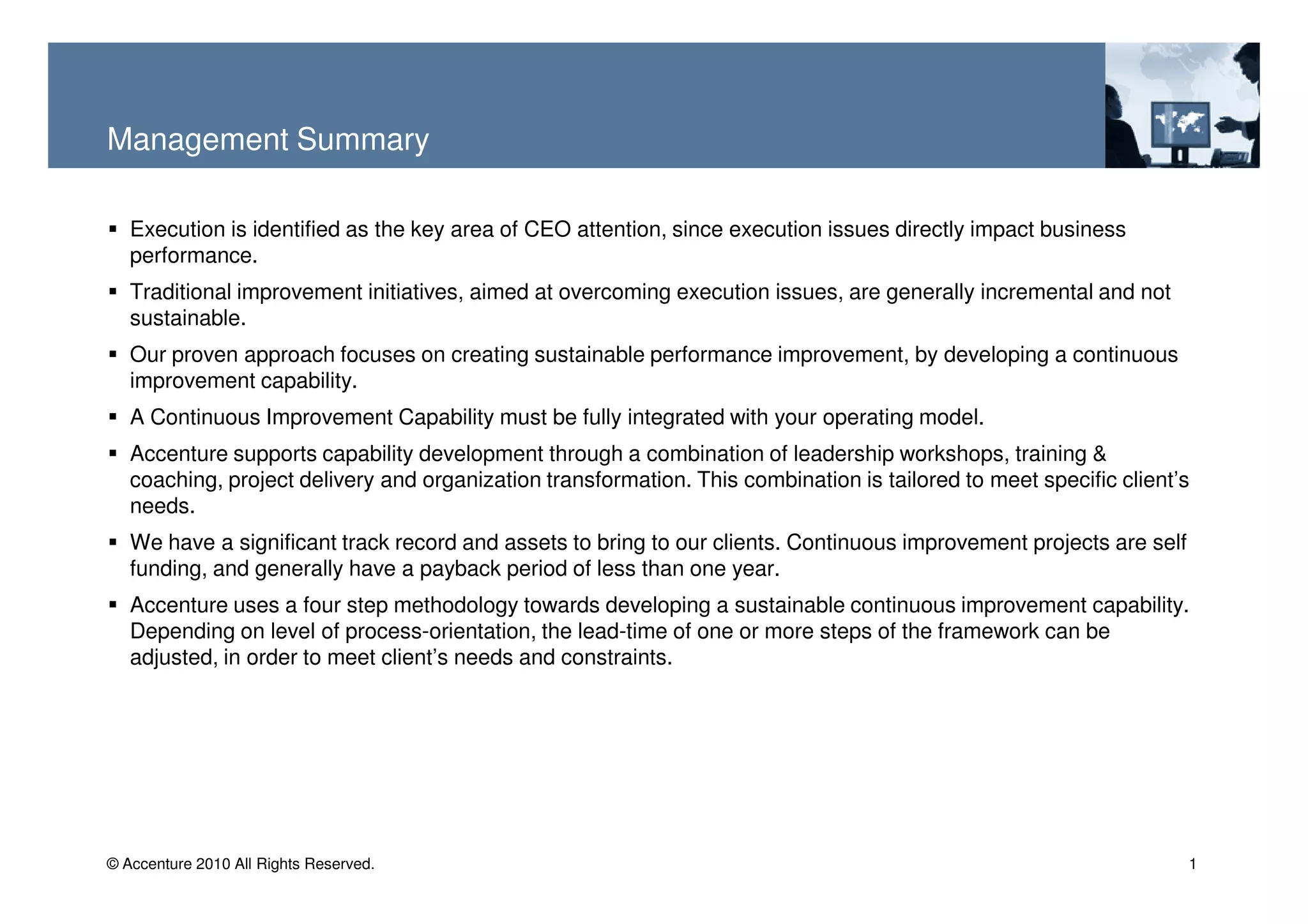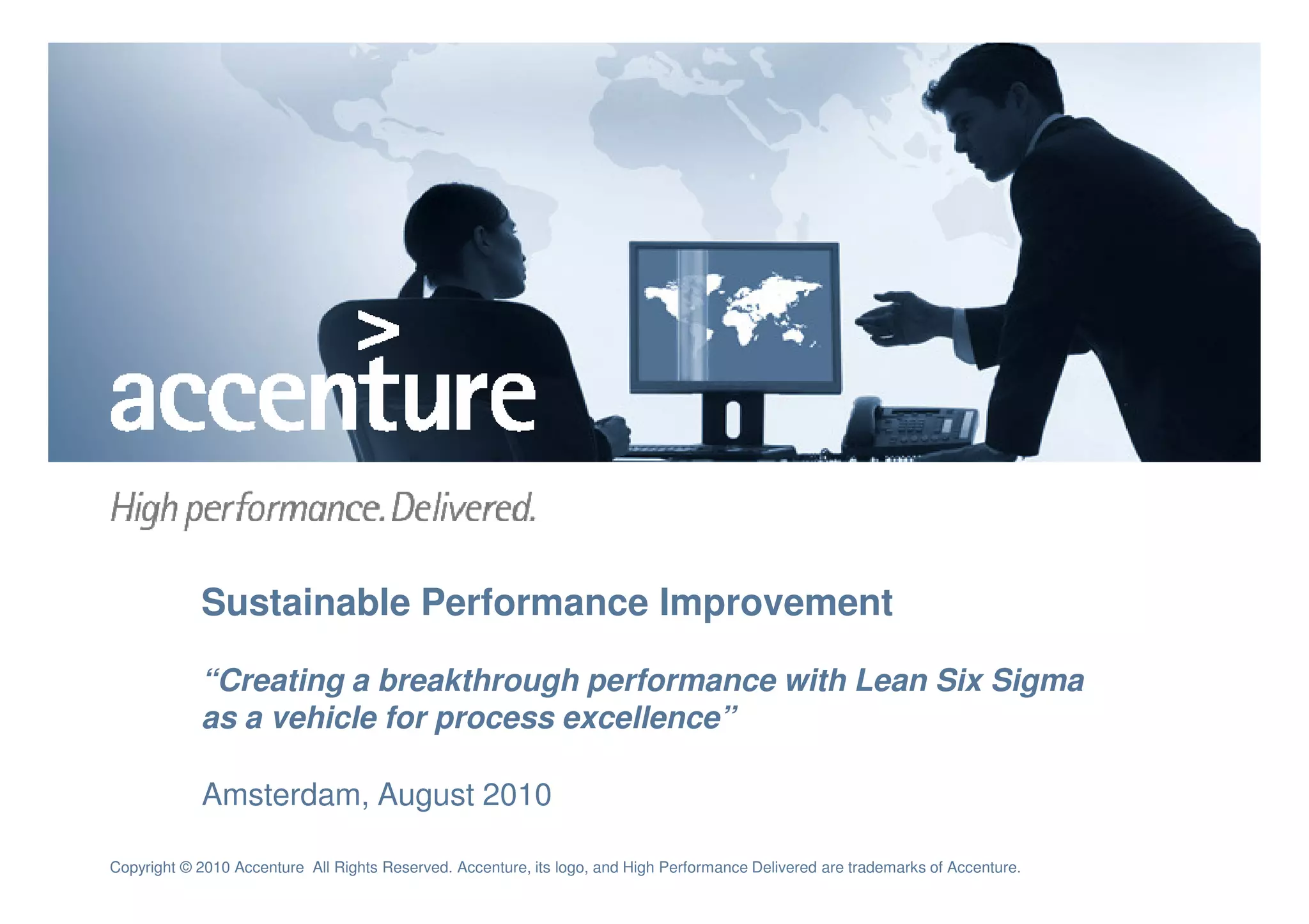 This document discusses developing a sustainable continuous improvement capability using Lean Six Sigma. It outlines a four step methodology: 1) Assess current processes, 2) Define improvement projects, 3) Implement projects using DMAIC, and 4) Sustain improvements through training and embedding in the organization. Accenture supports capability development through workshops, training, project delivery, and transformation tailored to clients' needs, with typical benefits including 20% lower costs and 40% faster times to market.