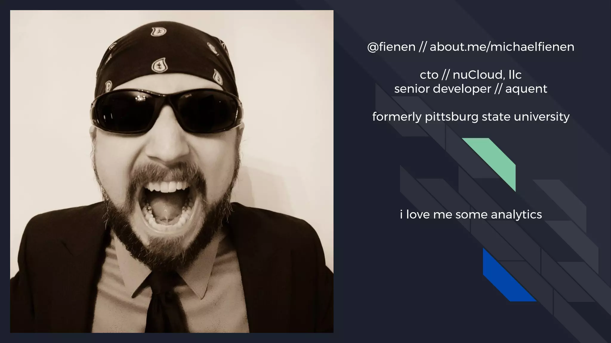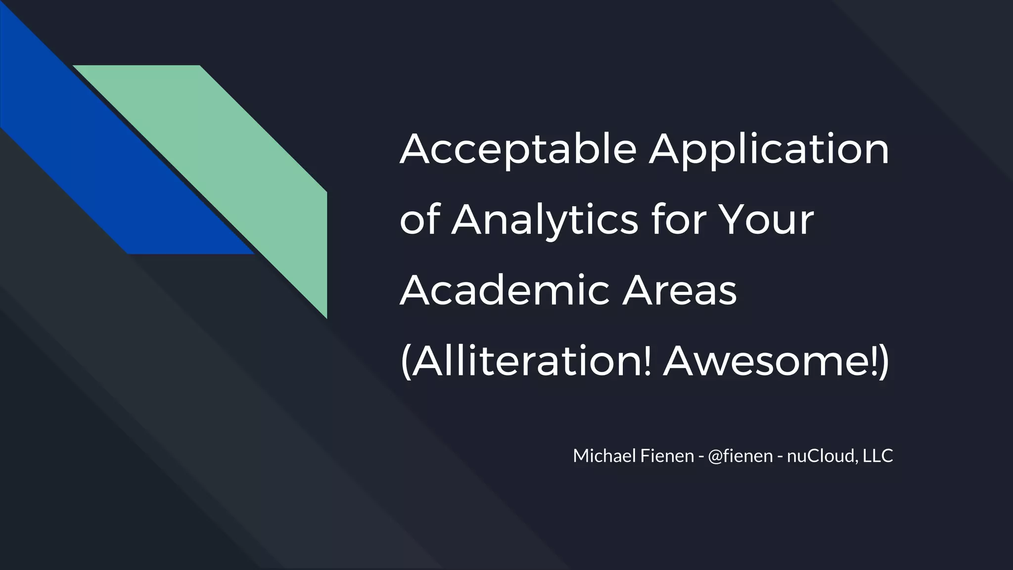 The document discusses the application of analytics in academic areas, emphasizing key performance indicators (KPIs) and the importance of optimizing analytics tools like Google Analytics and Tag Manager. It includes references to resources from industry experts and a playful tone throughout. The author, Michael Fienen, shares insights and encourages interactive learning with analytics.