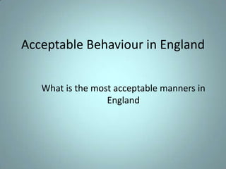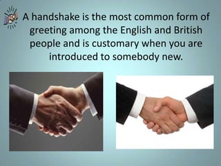 A handshake is the most common greeting in England. Men should remove hats indoors and say "excuse me" to politely get past someone. It is good manners to say "please", "thank you", and "sorry". Cover your mouth when coughing or yawning. Follow proper table manners like using utensils and not talking with your mouth full. Avoid public displays like hugging or asking personal questions. Women have equal status and independence in Britain.